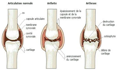 Diagramme illustrant l'articulation normale, l'arthrite et l'arthrose du genou, avec descriptions des structures comme l'os, la capsule articulaire, la membrane synoviale, la cavité synoviale, le cartilage, la destruction du cartilage, l'ostéophyte, le débris de cartilage.